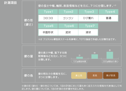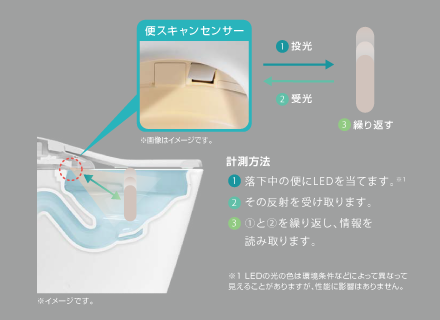 便スキャンセンサーで落下中の便をスキャンし、便の形(硬さ)・色・量を自動で計測します。